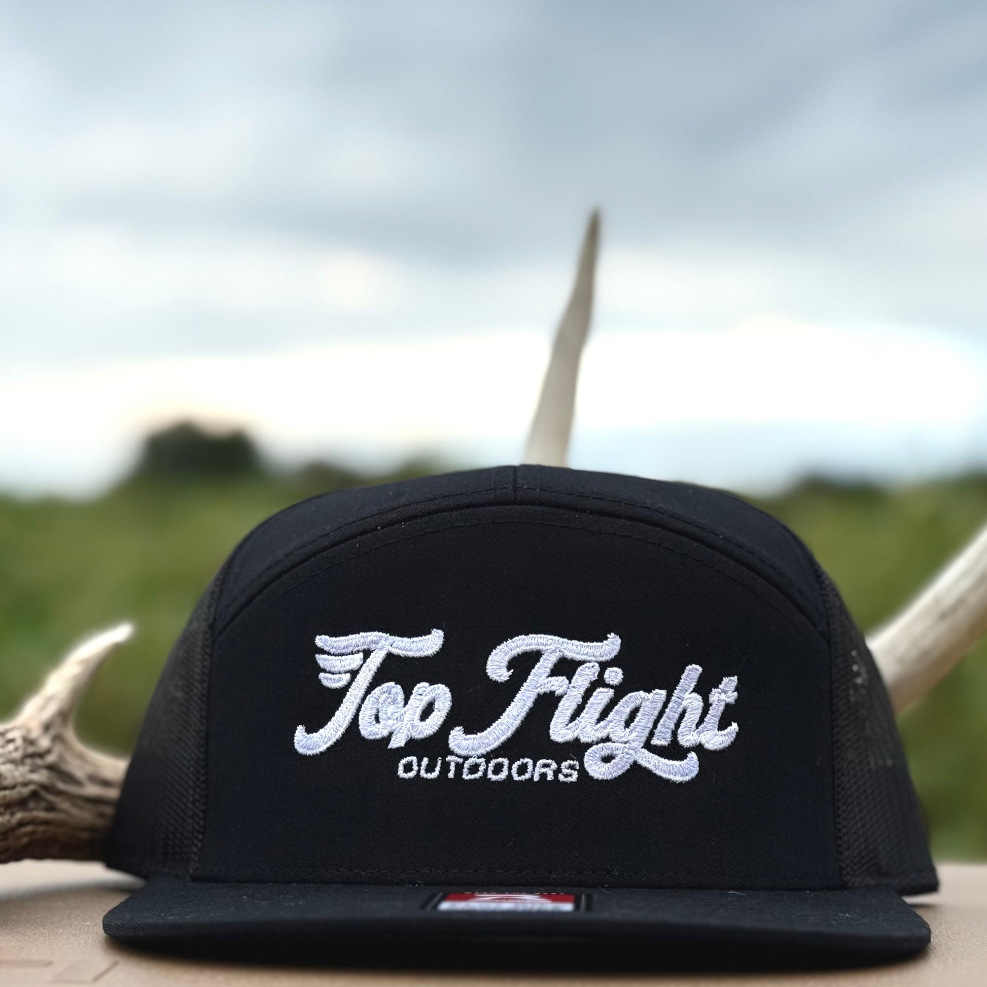 White embroidery on a black Richardson Panel 7 snapback.